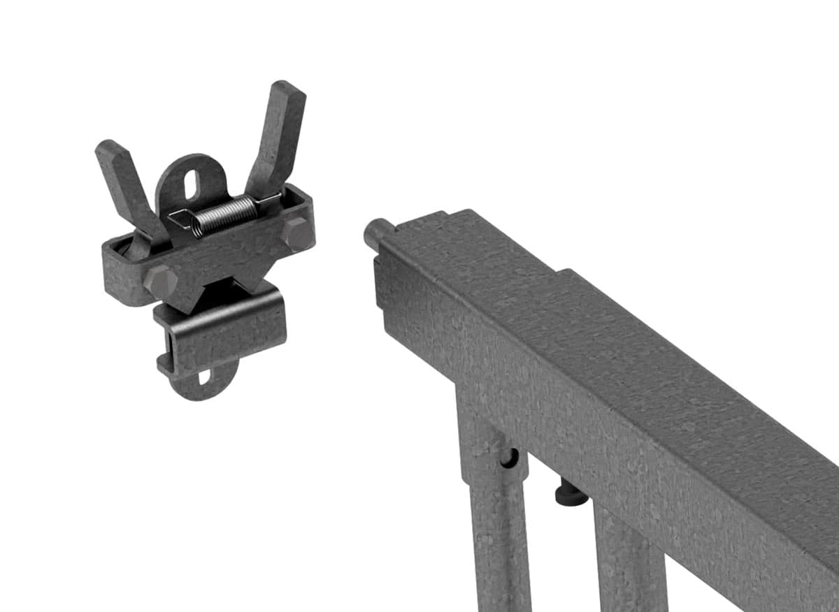 - Ferrure de fixation avec chapes épaisseur 10 mm et goussets de renfort. Œillet de réglage en partie basse.